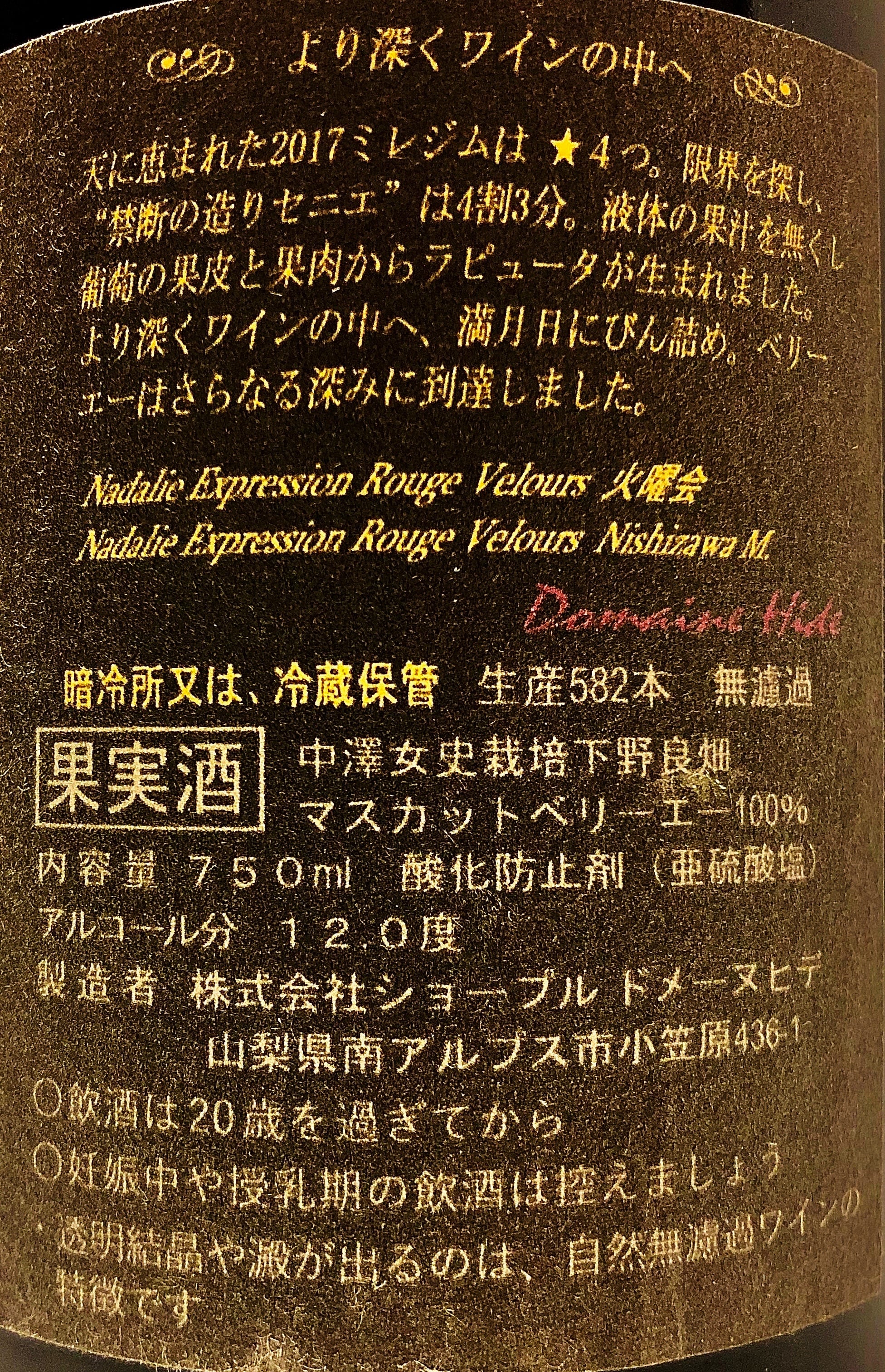 マスカッツトベーリーA100%使用。ドメーヌヒデをまずは試してみたいという方におすすめしたいフラッグシップワインです。