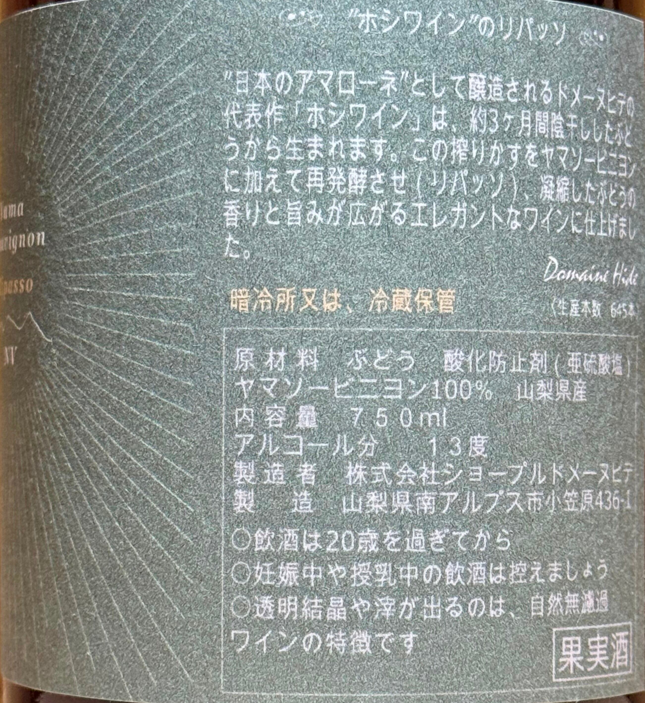 2023年VTのヤマソーヴィニヨンに、陰干ししたぶどうを使用して造られる「ホシワイン」の搾りかすを加えて再発酵。